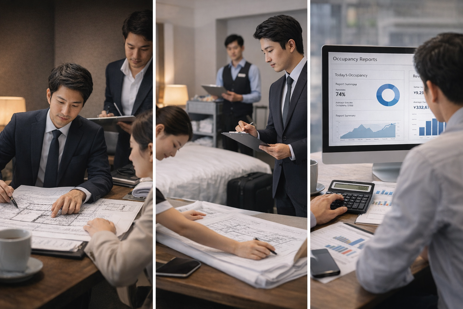 土地や事業計画の整理から、開業準備、運営体制構築までを支援し、事業として成立する宿泊施設づくりをサポートします。